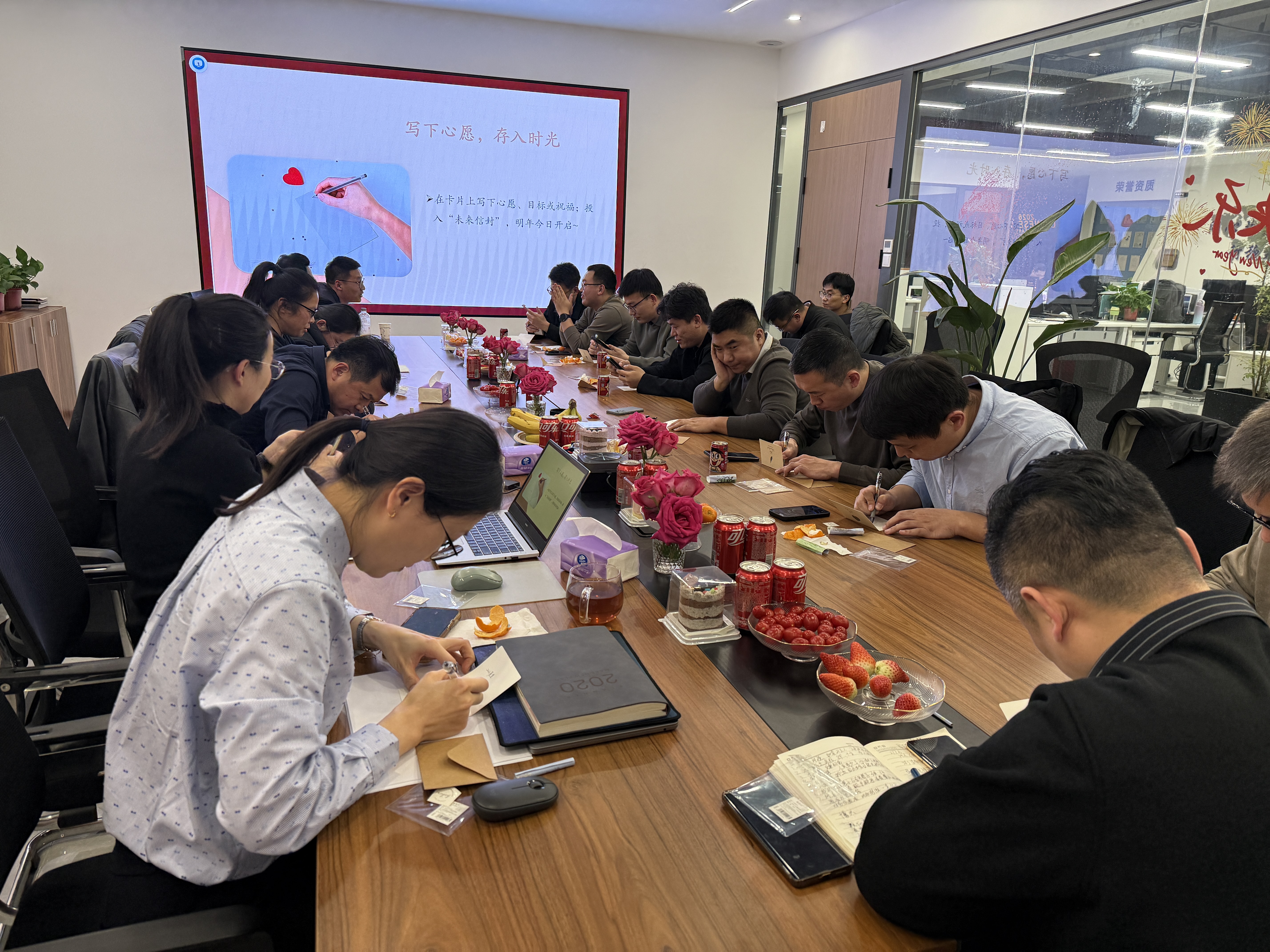 在随后的员工沟通会环节,围绕 “关于成长、关于遗憾、关于感动、关于期待” 四个主题,同事们展开了真诚的分享。大家既回顾了工作中克服困难、实现突破的成长时刻,也讲述了团队里那些令人动容的温暖点滴。张总在现场重点分享了2025年三个感动瞬间,高度赞扬了同事们敬业奉献、不畏艰难、协同攻坚的精神,为达成工作目标所付出的不懈努力。分享过后,大家自然地将目光投向即将到来的2026年,纷纷表达了对新一年的目标与期待。郑重写下对2026年的心愿、目标或祝福,并将其投入专属的“时光信封”中。这不仅是一张卡片,更是对自己的一份承诺,相约在明年收获时节共同开启。