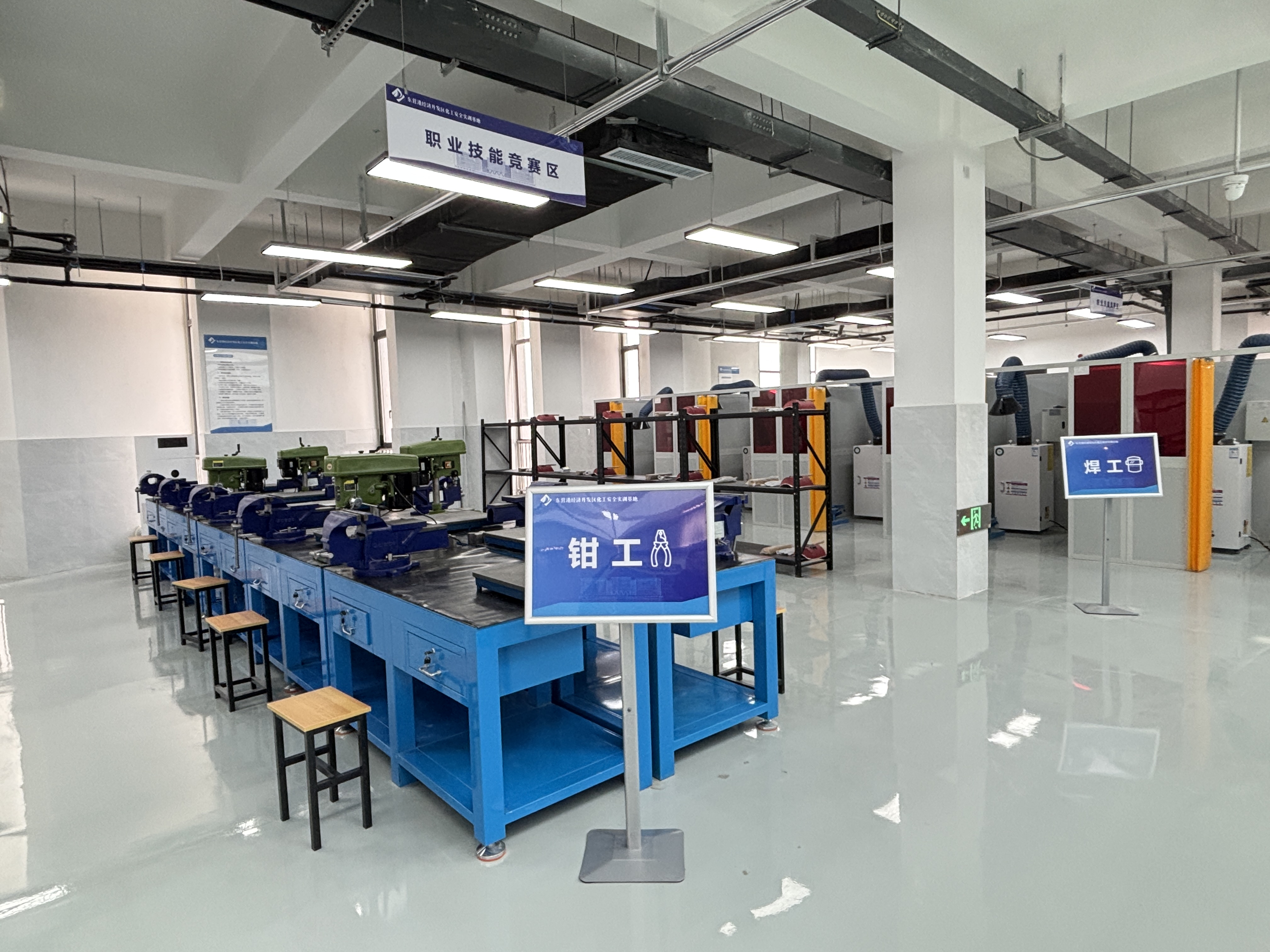 电工/钳工/焊工培训竞赛区:配备标准化工位、专业工具及智能考评系统,1:1还原作业场景,系统锻炼学员在设备安装、故障诊断、精密加工与安全焊接等方面的核心技能,弘扬“工匠精神”,夯实产业人才基础。